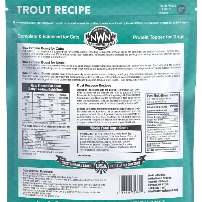 Northwest Naturals Trout Protein Boost is a complete and balanced diet for our feline family and the perfect topper or treat for dogs. The Protein Boost contains never-cooked, minimally processed raw proteins, retaining the integrity of the vitamins, minerals, and enzymes of the natural whole food.