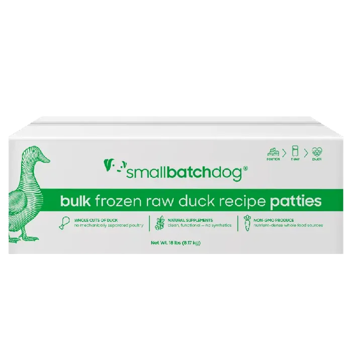 Smallbatch's raw diets use a limited-ingredient single-protein formula featuring 78-88% meat, organ and bone. Only made with meat that is humanely USA-sourced and antibiotic and hormone-free. Smallbatch proudly features no mechanically separated meat. All essential vitamins, minerals, and amino acids come from organic wholefood sources. Features convenient individual patties for easy feeding and portion control! Your dog will be licking their lips after tasting theses delicious raw diets! No Root Vegetables. Made in USA. Smallbatch is a trusted family-owned company that is proudly hand-chosen by the Pet Beastro!