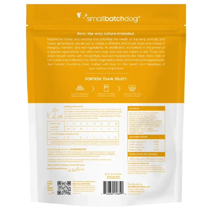 Single-source protein, complete raw diets for dogs featuring high meat, organ and bone recipes. Unlike other brands, smallbatch uses exclusively humanely raised, whole cuts of meat and naturally derived nutrients from whole foods. Portioned in convenient 1oz sliders or 8oz patties, meals are easy to thaw and serve. Confidently feed your dog a nature inspired, minimally processed, nutrient rich diet.