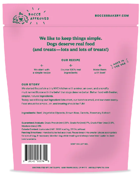 Our tail-wagging beef and carrot jerky sticks are baked with love and packed with natural goodness to keep your pup jingling all the way with joy!
