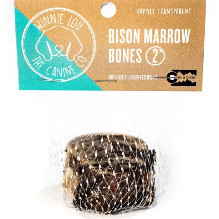 Winnie Lou Bison Marrow Bones are true to the Winnie Lou brand, utilizing even more local, Colorado Bison with hindshank and femur marrow bones. From the slow-roasted bison on the outside to the rich, delicious marrow on the inside. NO OTHER INGREDIENTS added. No spices, no salt, no rubs, no smoke, no charcoal, nothing harmful or toxic in the way our bones are slow-roasted. We roast them at a very low temperature, slowly over 40 hours ensuring the perfect amount moisture is maintained throughout the process, strengthening the bone, and preventing splintering and breakage as our furry friends